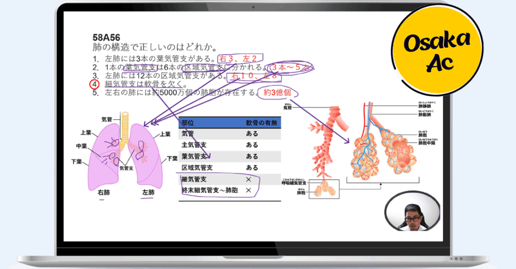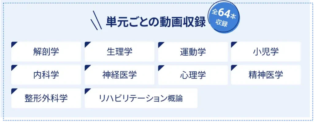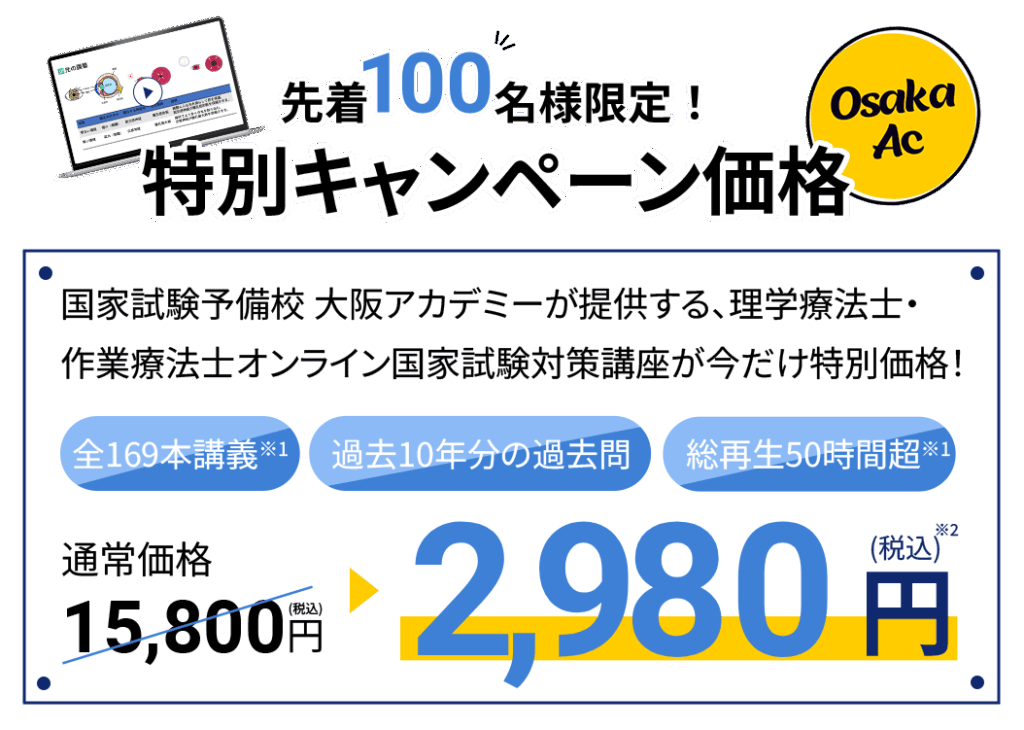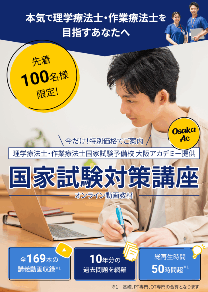 ※1 基礎、PT専門、OT専門の合算となります※2 基礎分野のみ(講義動画64本)の販売価格になります 第61回 理学療法士・作業療法士 国家試験対策中のあなたへ こんなこと、心当たりありませんか? 過去問は解けるのに、模試では合格点に届かない... とにかく丸暗記で覚えているだけになっている... 単元ごとに知識を整理できていない ... 不合格になる受験生に共通する特徴なんです... これらの特徴は、国家試験浪人生に特化した予備校大阪アカデミーで、多くの受験生を指導してきたからこそ分かったことです。努力しているのに合格できない…それは勉強のやり方そのものが間違っている可能性があります。 合格するために必要な正しい勉強方法とは? 過去10年分の過去問を単元ごとに整理する 設問の選択肢を徹底的に分析する 単元の要点を体系的にまとめて視覚化する この勉強方法が、国家試験に合格できるために最も確実な勉強法です。国家試験では、本質的な理解と応用力をいかに身につけるかが合格のカギとなります。 大阪アカデミーは理学療法士・作業療法士国家試験浪人生に特化した予備校です。大阪アカデミーの国家試験対策講座では、これまで多くの受験生を指導してきた経験を元に、✔つまずきやすい単元✔対策漏れの多い知識✔ミスしがちな問題形式をしっかりカバー。確実に国家試験に合格するために、試験問題への本質的な理解と応用力をしっかり身につく構成に仕上げました。 大阪アカデミー国家試験対策講座の特徴 「本質」を理解するから応用力が身につく 本教材では、出題者の意図や問題構造の“本質”から解説。出題形式が変わっても対応できる「応用力」が身につき、初見の問題でも得点力が上がる。 1スライド1テーマで要点が一目でわかる 複雑な内容も、表や図で単元ごとに整理し要点が一目でわかる。1枚のスライドに要点をまとめているので、どこが重要かがすぐにわかり、短時間で何度でも復習可能である。 過去問を単元別に構成し解説 過去10年分の過去問を単元別に整理し、全選択肢を一つ一つ丁寧に解説 。 繰り返される出題パターンが見えるから”何を問われる単元”なのか効率的に学習が可能である 。 ※1 基礎、PT専門、OT専門の合算となります ※2 基礎分野のみ(講義動画64本)の販売価格になります 合格者の声 模試でいつも不合格だった私が合格できました 第60回理学療法士国家試験合格 20代男性 勉強しても点数が伸びず、模試ではいつも不合格。 そんな私を救ってくれたのが、この映像教材でした。 「なぜ間違えるのか」「どこを覚えればいいのか」がはっきり分かる解説が、自分の弱点を一つ一つつぶしてくれました。 たった数ヶ月で点数が劇的に上がり、自己採点でも合格ラインをこえたときは感動しました。 本当にありがとうございました! 「解説の丁寧さ」が決め手でした 第60回理学療法士国家試験合格 20代男性 学校の授業だけでは理解が浅かったところを、この映像教材がすべて補ってくれました。 特に選択肢ごとの解説がわかりやすく、「なぜそれが正解で、なぜ他が違うのか」を明確にしてくれます。 苦手だった神経学や生理学も、何度も繰り返し見ることで自然と頭に入りました。 本番では迷わず正解できた問題も多く、合格できたのはこの教材のおかげだと思っています! あと一歩で落ちた私が“逆転合格” 第60回理学療法士国家試験合格 20代女性 1年目は1点差で不合格…ショックで何も手につきませんでした。 でもこの映像教材は、「落ちた人がどこでつまずくのか」に焦点を当てていて、自分にぴったりでした。 1問1問に込められた丁寧な解説と、理解を深める工夫が満載で、「今度こそ合格できる」と信じて勉強を続けられました。 合格発表の日、「やっと報われた」と心から思いました。現役時代の自分に見せてあげたい教材です! 簡単3ステップ ご購入の流れ FAQ よくある質問 専門分野は講座に含まれますか? 専門分野教材は現在制作中で、完成次第、順次販売開始予定です。 講座はいつまで販売していますか? 販売期間の制限はございません。ただし、今回のキャンペーン価格は先着順で100名様限定となっておりますので、早めのご購入をおすすめします。 講座の受講料は月額制ですか? いいえ。お支払いは一度きりの買い切り価格です。 追加の課金は一切ございませんので、ご安心ください。 講座の支払方法について教えてください。 クレジットカード、コンビニ決済、銀行振込、PayPayからお選びいただけます。 申込者とクレジットカードの名義が違っても大丈夫ですか? はい、問題ありません。保護者様名義のクレジットカードでのお支払いも可能です。 クレジットカードも銀行口座も持っていません。どうすればいいですか? コンビニ決済(全国のコンビニ※セブンイレブンを除く)、PayPay払いをご選択ください。 動画がうまく再生できない場合はどうすればいいですか? ご案内メールに記載のサポート窓口へご連絡ください。通信環境